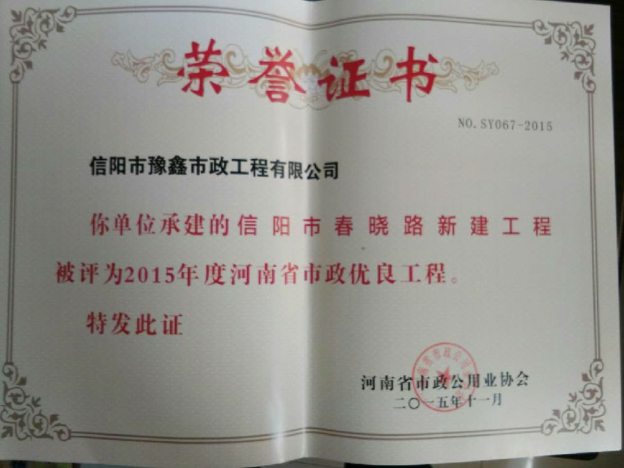 好風(fēng)憑借力,送我上青云。近年來,公司積極參與城市市政基礎(chǔ)設(shè)施建設(shè)施工,積極參與市場競爭,先后承擔(dān)施工了市政府重點(diǎn)工程南京路道路改造工程、春曉路道路改造工程,東方紅大道道路改造工程、龍江東路新建工程等重點(diǎn)民生工程,其中南京路道路改造工程被省建設(shè)廳評為“中州杯”, 春曉路和東方紅大道道路改造工程被省建設(shè)廳評為“省優(yōu)工程”,成為城區(qū)一道道亮麗的風(fēng)景線。參與施工了市典范小區(qū)“臺北城上城”、“恒大名都”以及師范學(xué)院、職業(yè)技術(shù)學(xué)院、交警支隊(duì)和軍區(qū)道路工程,參與施工了雞公山管理區(qū)、南灣管理區(qū)、明港鎮(zhèn)和羅山縣等部分道路小區(qū)工程施工,累計(jì)大小各類施工工程三百余項(xiàng),企業(yè)影響力不斷擴(kuò)大、輻射力不斷增強(qiáng),市場份額不斷提高,企業(yè)信譽(yù)不斷彰顯,為信陽城市建設(shè)做出了積極貢獻(xiàn),為企業(yè)的可持續(xù)發(fā)展插上了騰飛的翅膀。